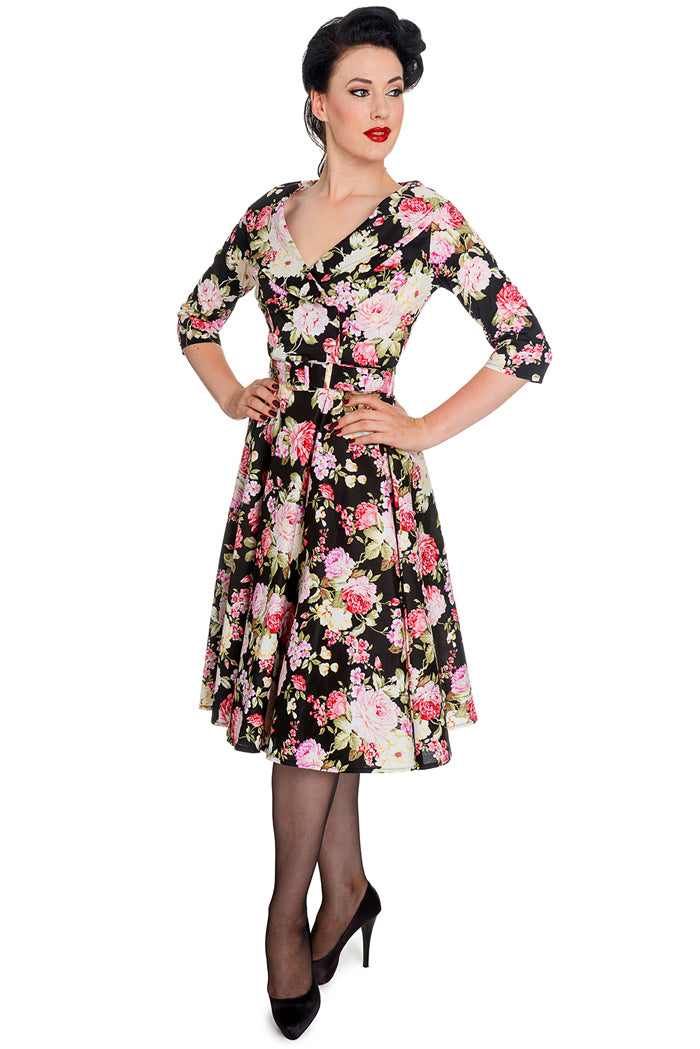 Hell Bunny BLACK DAHLIA Vintage 50s COLLAR 3/4 Arm SWING Floral KLEID