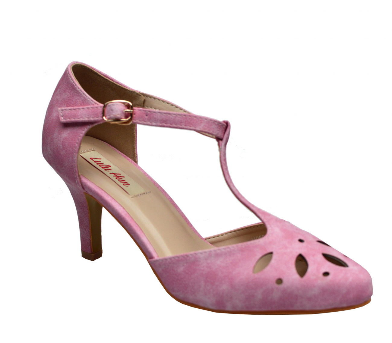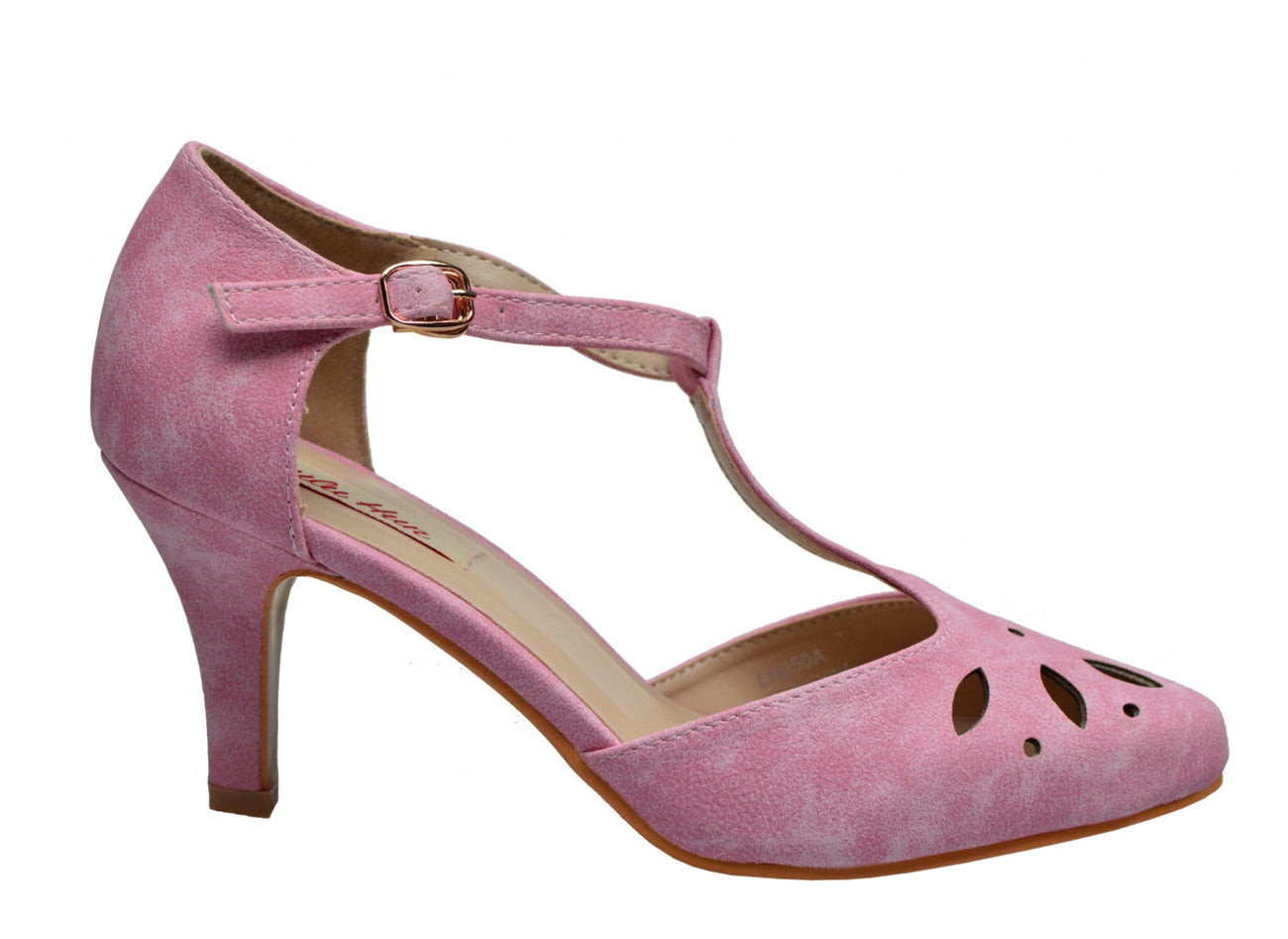 Lulu Hun JOAN Vintage T-Riemen Blumen Cut-Out Pin Up 50er High Heel Pumps - Rosa